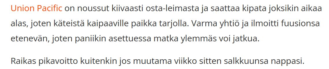 Joka tapauksessa UNP kuuluu osakkeisiin, jotka saavat osta-leiman taas kun tekninen analyysi suosii. Jossain kohtaa se houkuttaa taas isoakin rahaa varmuudellaan.